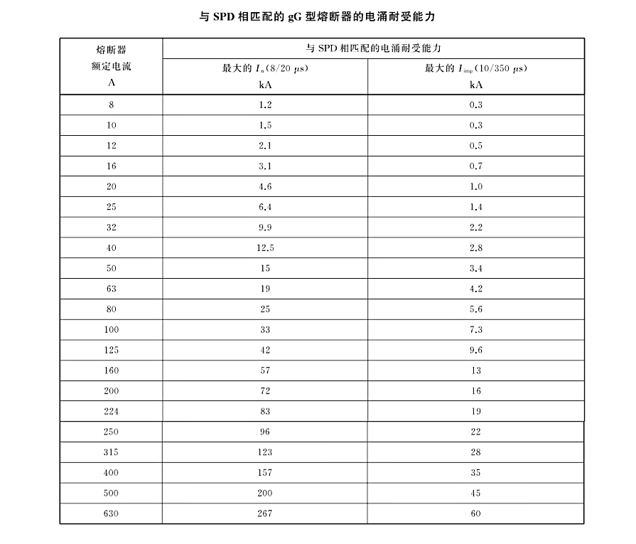 當(dāng)外部脫離器采用gG型熔斷器,根據(jù)熔斷器標(biāo)志、標(biāo)識(shí)或產(chǎn)品資料中的額定電流,按表格確認(rèn)對(duì)應(yīng)的與SPD相匹配的電涌耐受值.該值不小于與其相連的被保護(hù)SPD的相應(yīng)參數(shù)。