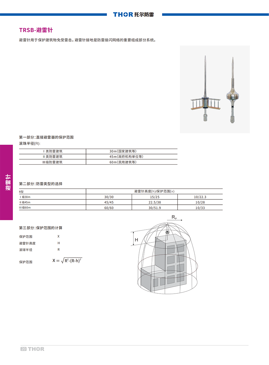 TRSB系列避雷針是用來保護建筑物、高大樹木等避免雷擊的裝置。在被保護物頂端安裝一根接閃器,用符合規(guī)格導線與埋在地下的泄流地網(wǎng)連接起來。避雷針規(guī)格必須符合G B標準,每一個防雷類別需要的避雷針高度規(guī)格都不一樣。